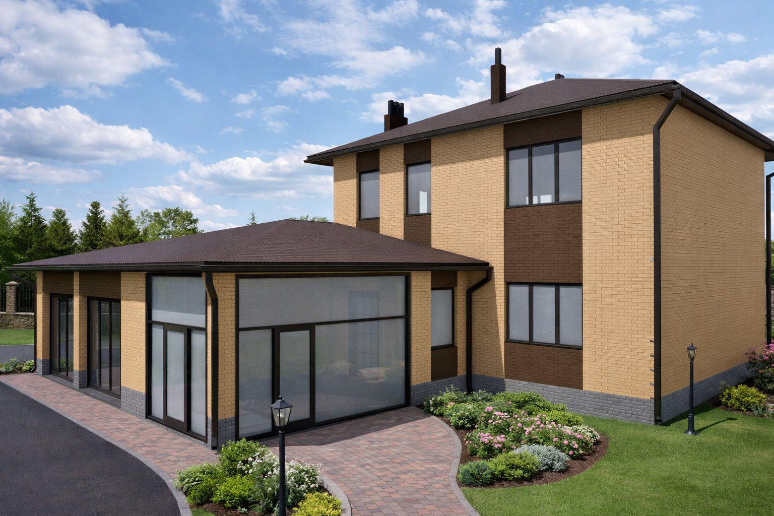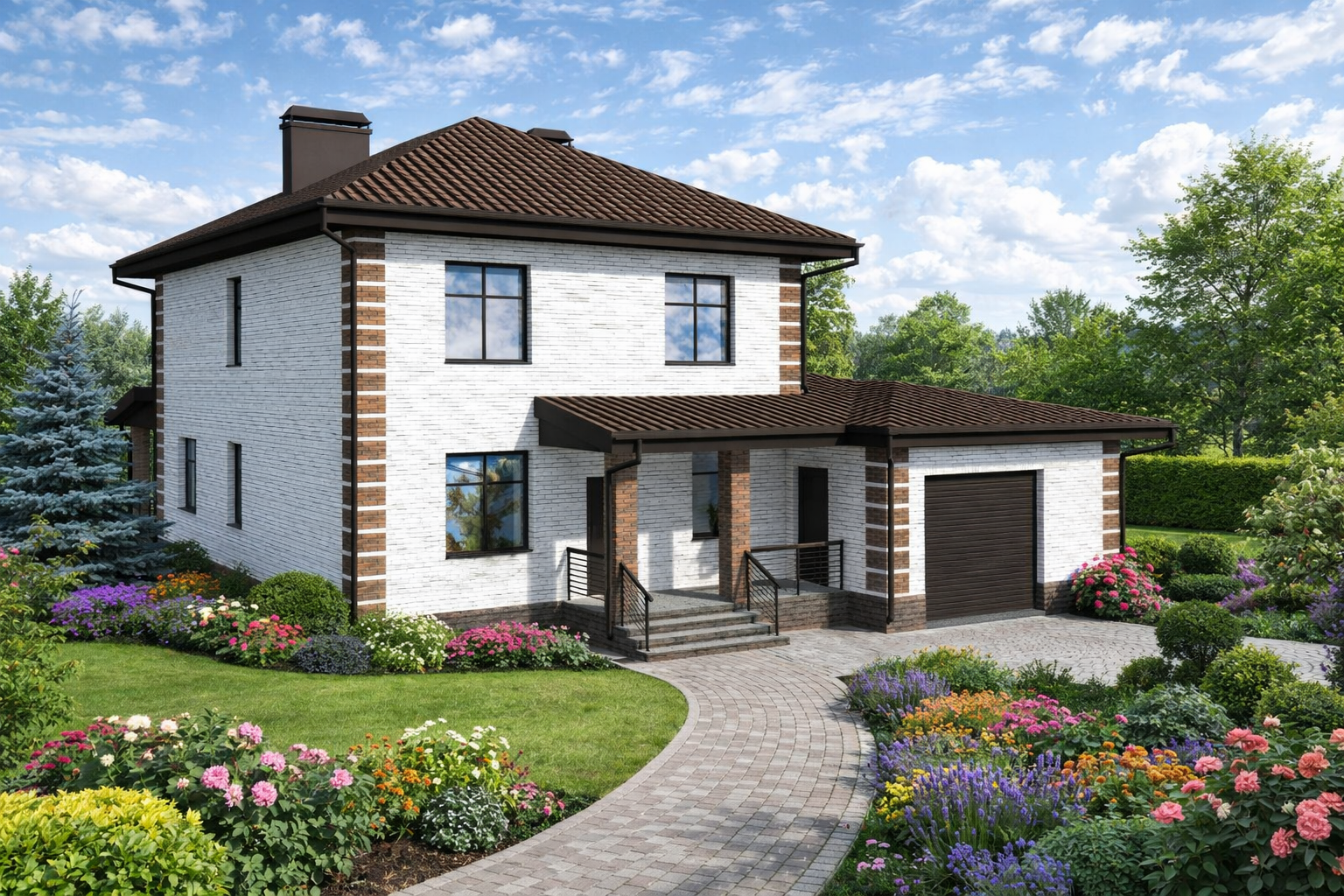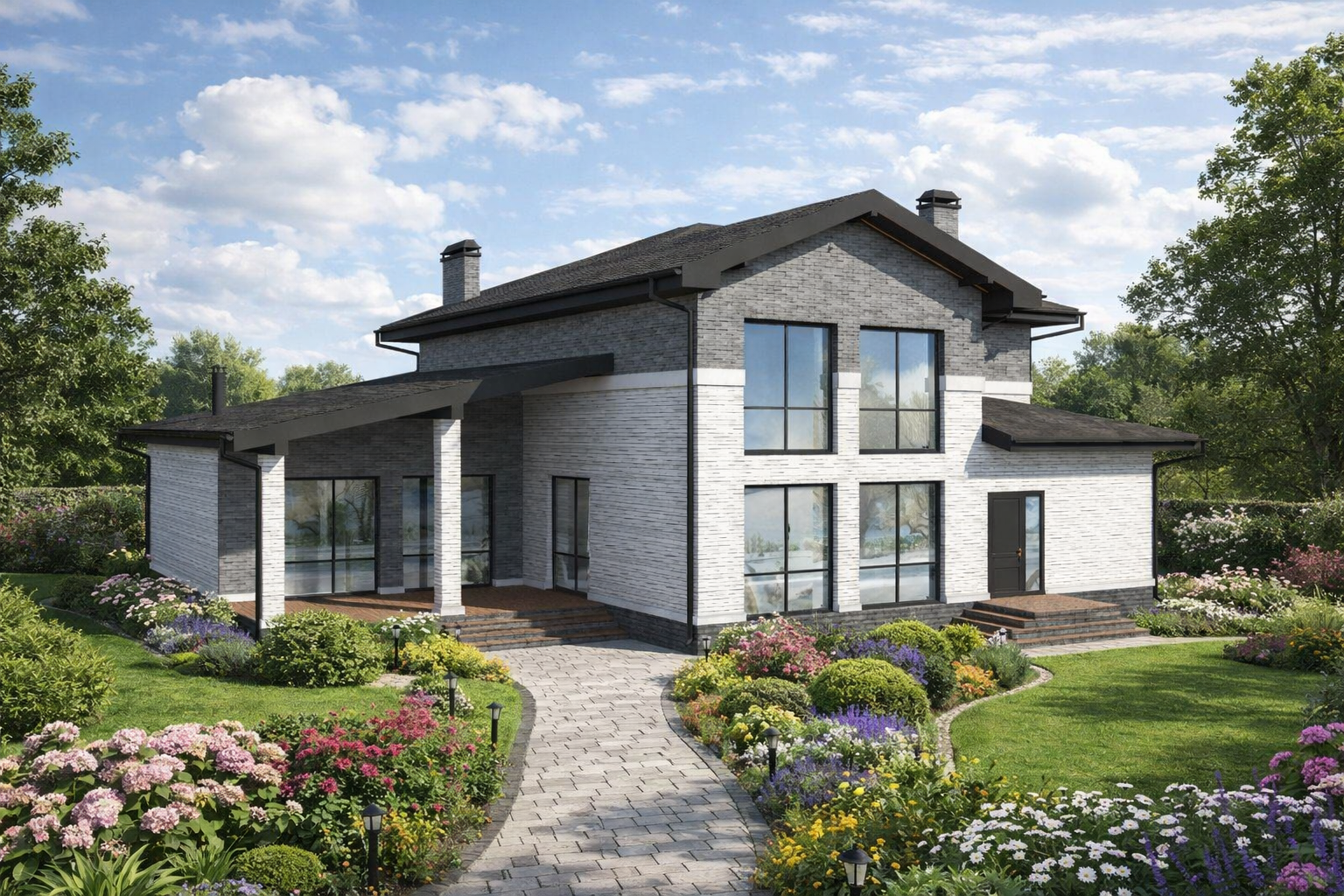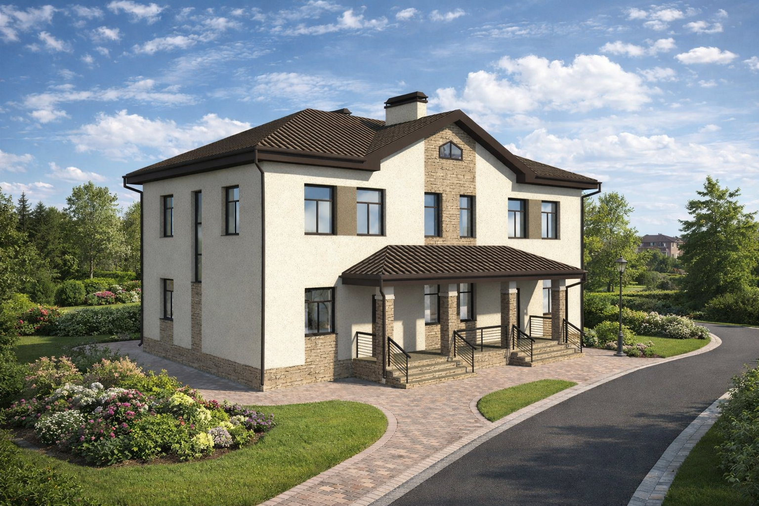 Еще одно преимущество заказа индивидуального проекта дома – это возможность создания подробной визуализации его внешнего вида. На этом этапе можно визуально оценить как в итоге будет выглядеть уже полностью завершенный проект. Это очень удобно когда вы не уверены в каком стиле нужно выполнить постройку в уже существующем комплексе строений. Здесь мы приводим пример визуализации дома одного из наших клиентов
