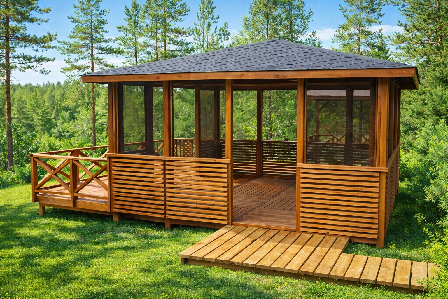 Беседка — это место, где рождаются самые теплые воспоминания. Утренний кофе в одиночестве под пение птиц, шумные застолья с друзьями, тихие вечера с книгой, детский смех и аромат шашлыка — беседка становится центром притяжения всей семьи. Мы создаем пространство, где хочется проводить время, где уютно в любую погоду и где каждый чувствует себя как дома. Натуральное дерево дарит особую атмосферу тепла и покоя, которого так не хватает в городской суете.